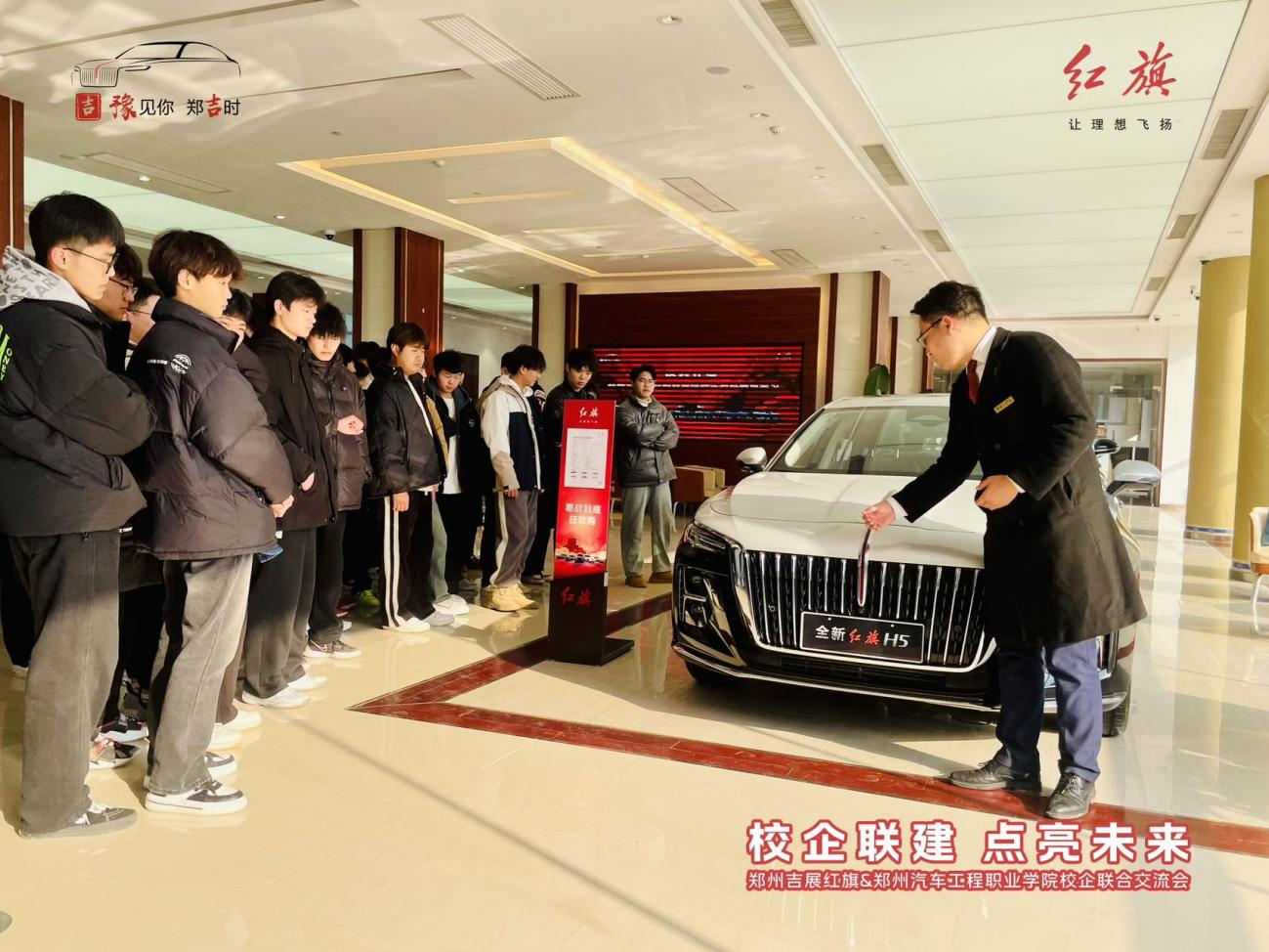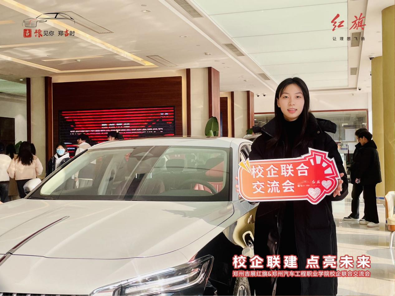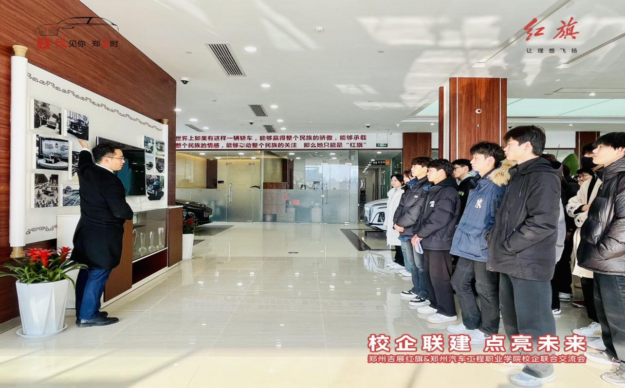 在郑州吉展红旗大厅,同学们观看了“一汽红旗”官方宣传片,了解我们国家建国以来的标志性事件和重大成就:新中国的第一台汽车制造、第一颗原子弹爆炸、第一次卫星发射、第一次申奥等等;让同学们深切感受到国产品牌的历史厚重。