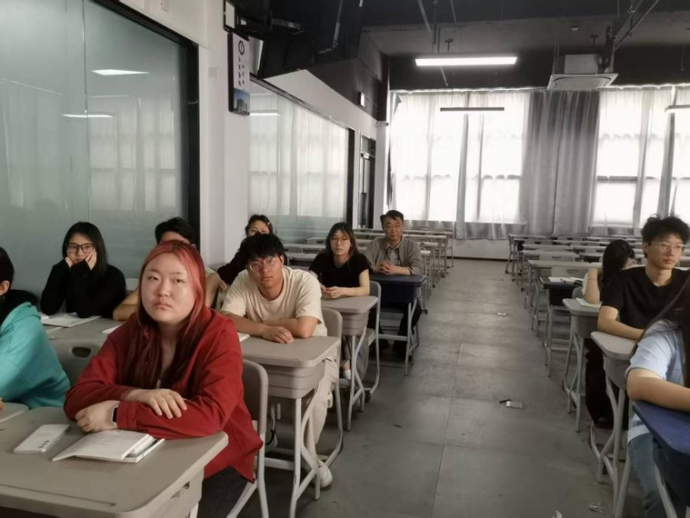 薛培军认真听殷盛杰的讲课,并观察学生的学习状态。他肯定殷盛杰讲课内容丰富,观点正确。但认为启发学生讨论不够,互动不足,希望以后改进。
