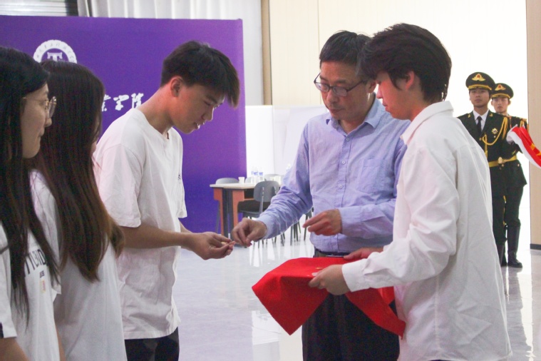 随后,党委书记张瑞春,电子信息工程学院副院长、团总支书记于艳鹏,电商物流学院副院长、团总支书记杜天亮分别为新团员代表佩戴团徽。闪闪发光的团徽不仅象征着共青团员的光荣身份,更承载着责任与担当,激励新团员们在今后的学习生活中严格要求自己,发挥先锋模范作用。