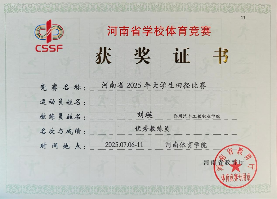 作为河南省大学生田径项目的最高规格赛事,本届运动会由河南省教育厅、河南省体育局主办,河南体育学院承办,吸引了全省126所本专科高校的近1500名运动员参赛。我校这次选派了4名男生参赛,参加了男子100米、200米和4x100米、4x400米项目的角逐。虽然是首次参赛,但我校运动健儿不畏强手,顽强拼搏,得到了赛事组委会及兄弟院校的一致好评。最后经过评选,我校刘瑛老师荣获优秀教练员称号,学生付启明荣获优秀运动员称号。