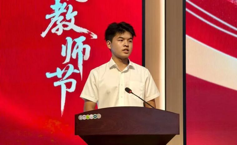电子信息工程学院云计算技术应用2401班陈润龙同学作为学生代表发言,向全校教师致以节日的祝福和诚挚感谢,并表示承诺将以优异成绩回报老师的辛勤培育。