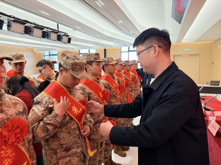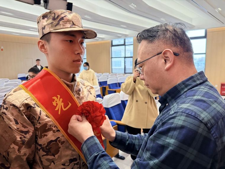 孙红军、王新宇及各学院负责人为入伍学生佩戴光荣花、系上绶带并赠送纪念品。
