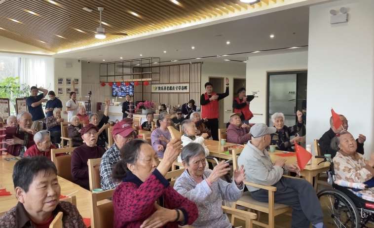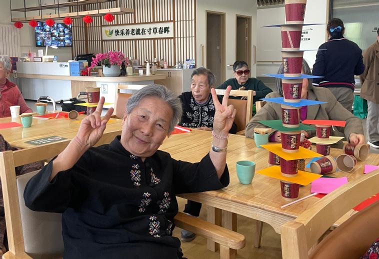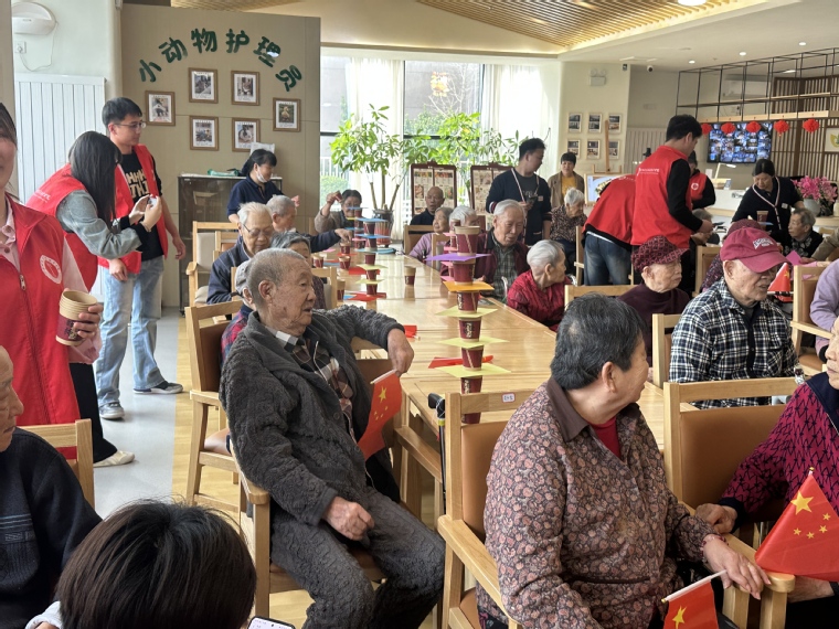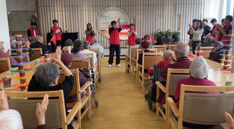 除了精彩的才艺展示,趣味游戏互动环节更是将欢乐推向高潮。“纸杯叠叠乐”游戏中,老人们神情专注,手眼协调,将纸杯叠得又高又稳,老人们与志愿者配合无间,活动现场欢声笑语不断。随后,在志愿者的带领下,大家一起做起了“清肺拍拍操”,在简单的拍打中放松身心,感受运动的快乐。