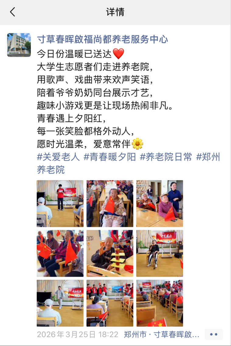 为弘扬尊老敬老的传统美德,传递青春正能量,2026年3月25日,我校12名青年志愿者们满怀热情,走进中原区寸草春晖啟福尚都养老院,开展志愿暖心服务活动,为老人们带去欢声笑语与温暖陪伴。