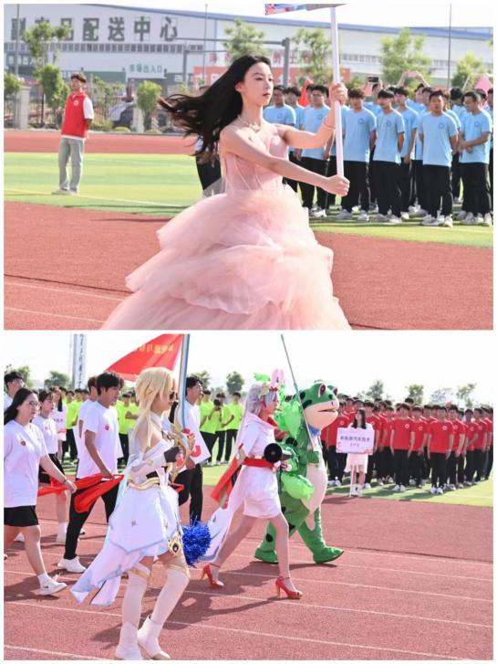 方阵成员们身着统一的服装,迈着整齐的步伐,喊着响亮的口号,精神抖擞地走过主席台。他们的服装融合了多样元素,展现了学院的特色与活力。