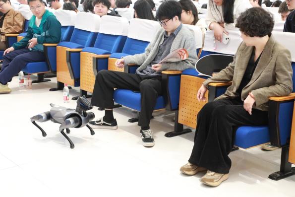 分享会现场亮点纷呈,机器狗展示环节点燃全场热情。灵动的机器狗完成行走、转向、互动等一系列精准操作,直观展现了智能机器人技术的前沿成果,让同学们近距离感受到了数智技术的魅力与力量,现场掌声不断。数智学子纷纷表示,此次分享会不仅让自己对小米的技术实力与行业发展有了更深刻的认知,更激发了专业学习的热情与动力,为未来的职业发展明确了方向。
