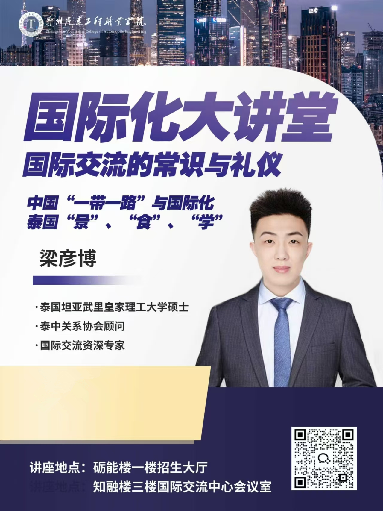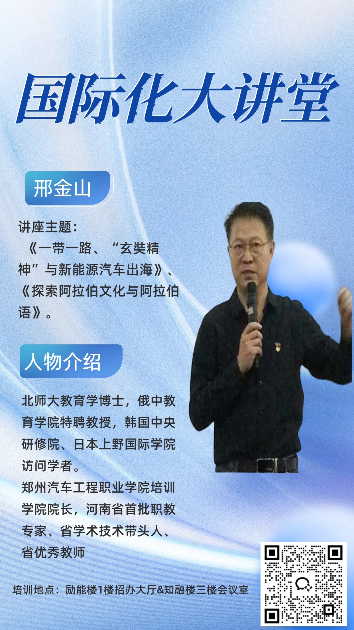 为积极响应国家“一带一路”重大倡议,全面提升我校国际化办学水平,进一步拓宽同学们的全球视野与跨文化交流能力,培训学院特此举办“国际化教育大讲堂”系列讲座。我们诚挚邀请校内外多位优秀讲师,围绕国际化教育的核心议题,为同学们带来一系列精彩纷呈、深入浅出的知识盛宴。现就相关事宜通知如下,望广大师生踊跃参与,共同学习进步。