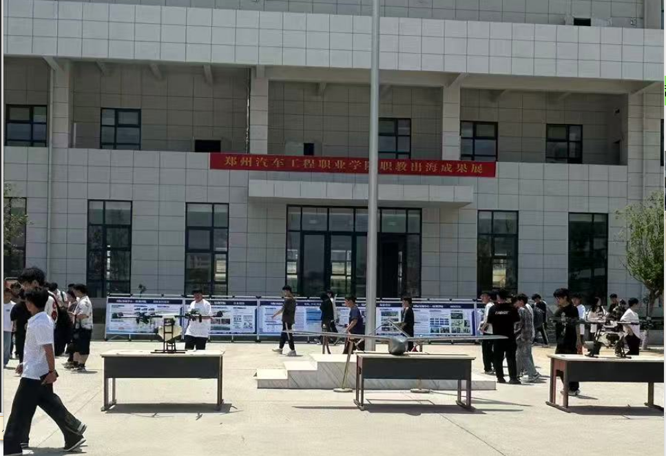 活动现场,通过海报、图片、视频、实物等丰富媒介,全方位展示了我校职教出海成果。八个项目部各展风采:泰国项目部促中泰教育交流,博仁大学校长曾访问我校的片段依稀可见,敲定了48 名泰国学生将赴校学新能源汽车技术,海报上中泰师生交流的温馨画面、图片里泰国校园的异域风情,都在诉说着这段跨越国界的教育情谊;韩国项目部展示了前期研学交流成果,今年暑期将开展赴韩研学交流活动,视频中韩国校园的美丽风光、研学活动中的精彩瞬间,吸引着众多目光;日本项目部虽未详述,但通过展示的特色图片,也让人感受到中日教育交流的潜在活力;法德西项目部承载欧洲文化,未来有望深化交流,实物展品中带有欧洲元素的纪念品,仿佛在预告着未来合作的广阔前景;无人机项目部代表前沿科技探索,现场展出了三款中大型无人机,它们造型独特、功能强大,配合视频中无人机在各种场景下的精彩飞行表演,成为职教创新名片;新能源汽车监测项目部推动技术出海,助力全球新能源产业发展,海报上展示的技术应用场景、图片里技术团队的忙碌身影,彰显着学校在新能源领域的国际贡献;国际仓储联合会产教融合项目部搭建校企合作桥梁,为学生提供出海机会,图片中企业与学校合作会谈的友好场面、视频里学生在企业实习的成长历程,让人们对学生的海外就业充满期待;跨境电商项目部顺应电商潮流,培养国际电商人才,展示的电商平台数据、学生电商创业成果实物,凸显了项目的实践成效。