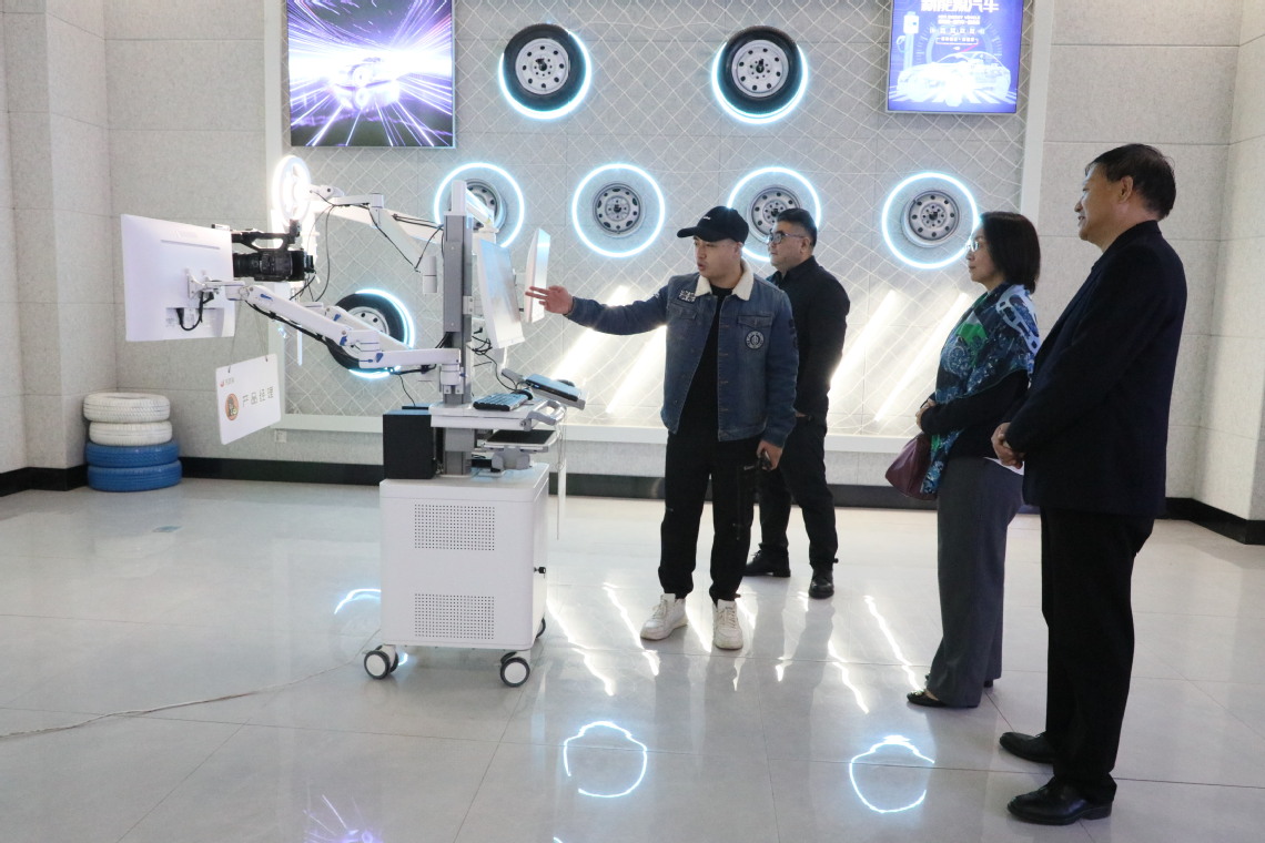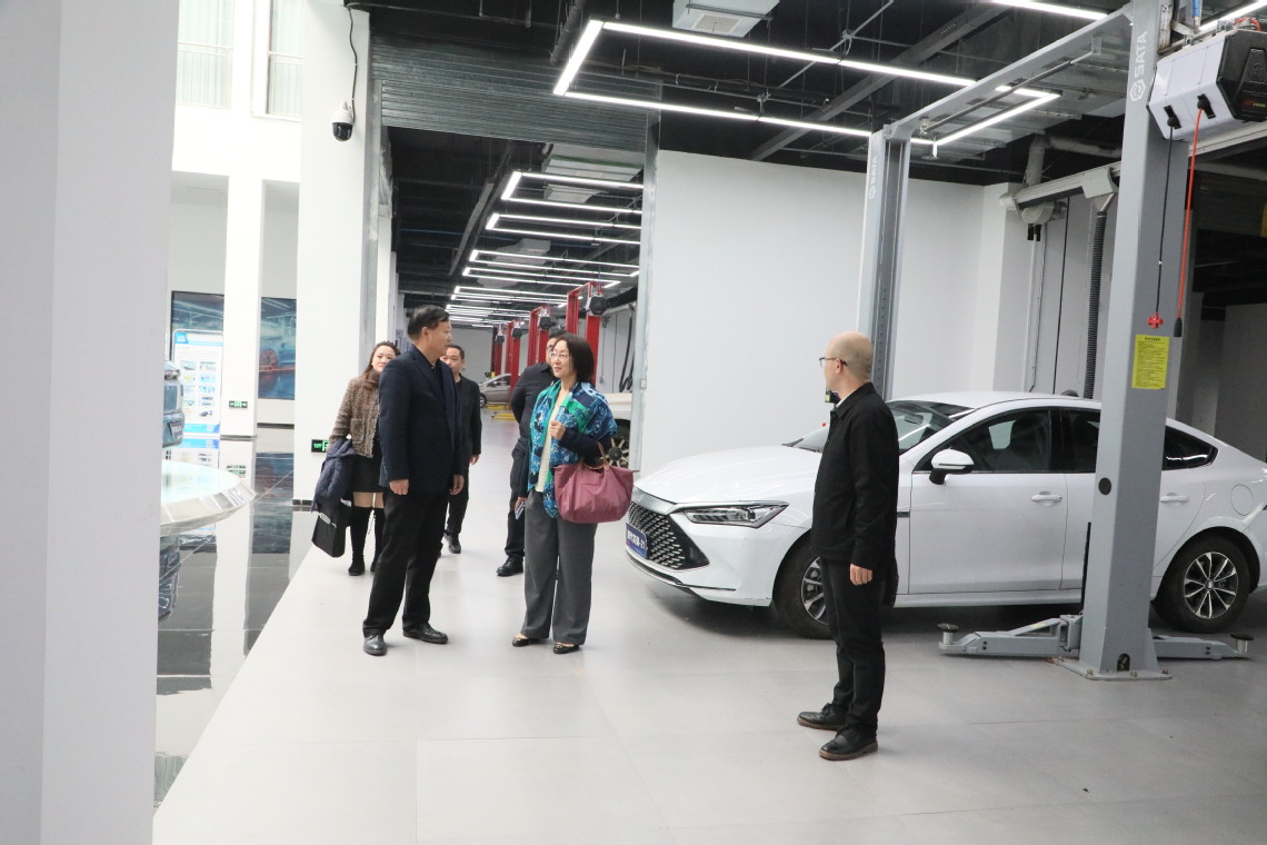 董玉军女士一行首先参观了我校汽车工程中心与电商直播中心。在汽车工程中心,详细了解了实训设备配置、教学模式及学科建设成果,国际交流与培训学院院长邢金山教授针对目前正在合作的新能源汽车检测与维护(易检车服)培训项目进行了设备的讲解和目前该培训内容面向的就业方向做了说明;在电商直播中心,现场观摩了学生直播实操,对我校产教融合的教学理念给予高度评价。