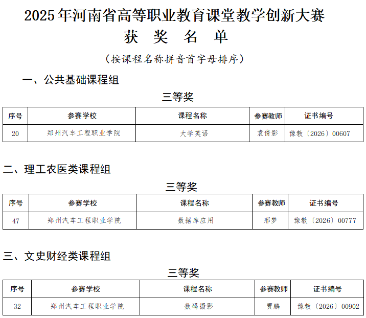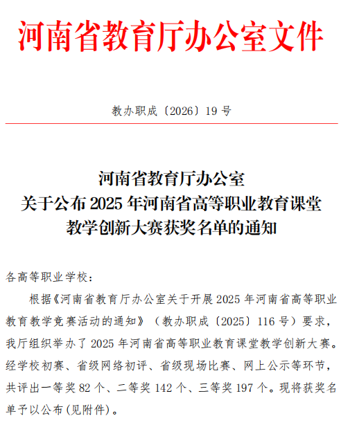 近日,河南省教育厅公布了2025年河南省高等职业教育课堂教学创新大赛获奖名单。该赛事是我省高等职业教育领域的高水平教学竞赛,旨在深化教学改革、激发创新活力,推动课堂提质增效。