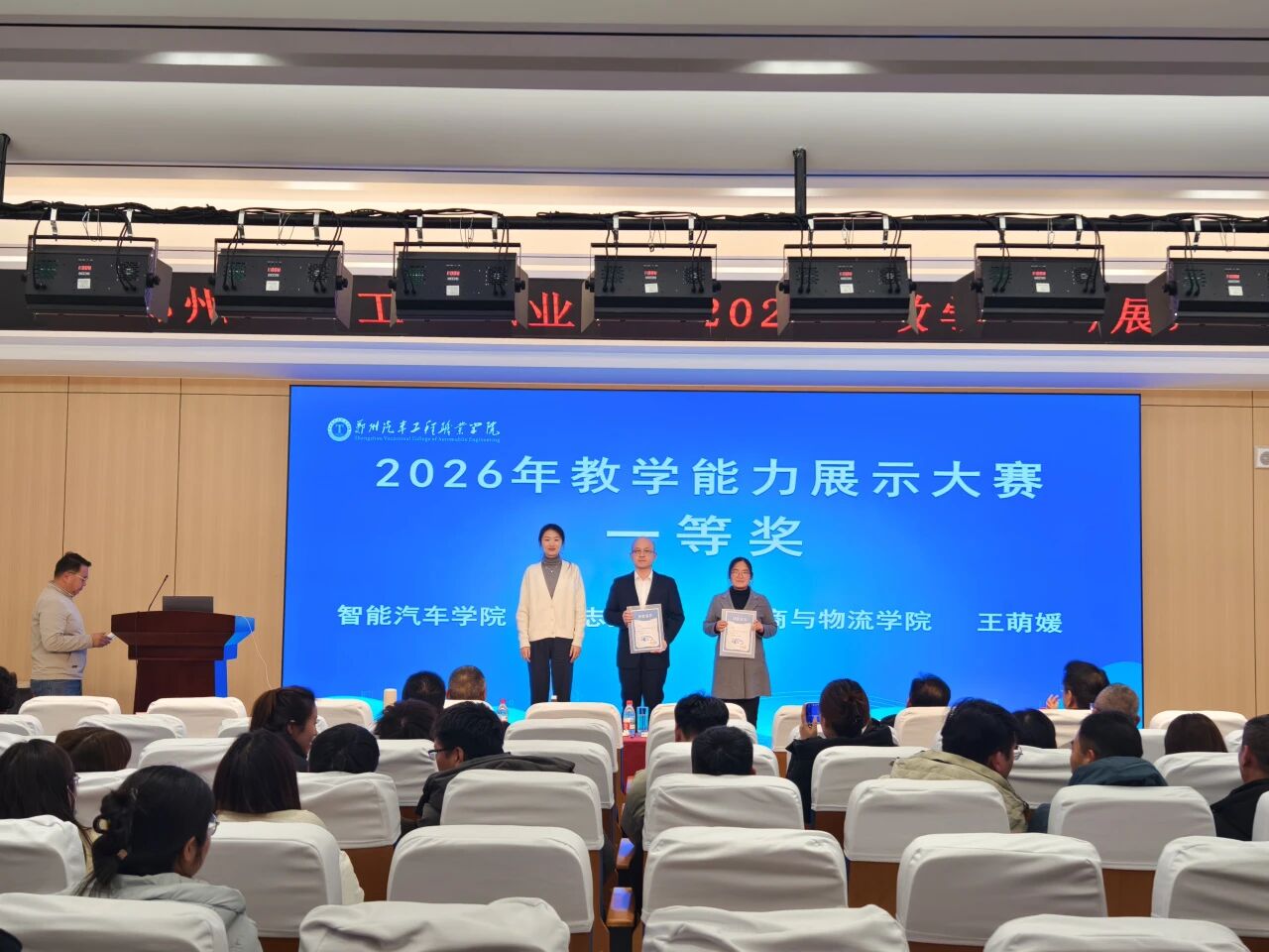 颁奖环节揭晓了获奖名单:智能汽车学院于志勇、电商与物流学院王萌媛获一等奖;新能源汽车学院夏欣鑫等4名教师获二等奖;新能源汽车学院聂双印等6名教师获三等奖。荣誉证书既是对获奖教师教学能力的肯定,更是对全校教师深耕教学、潜心育人的激励。