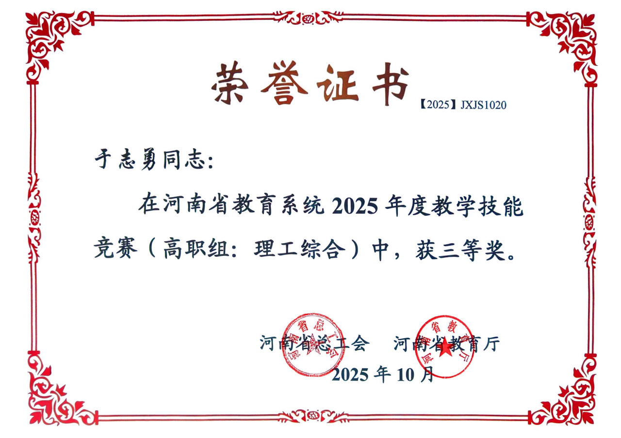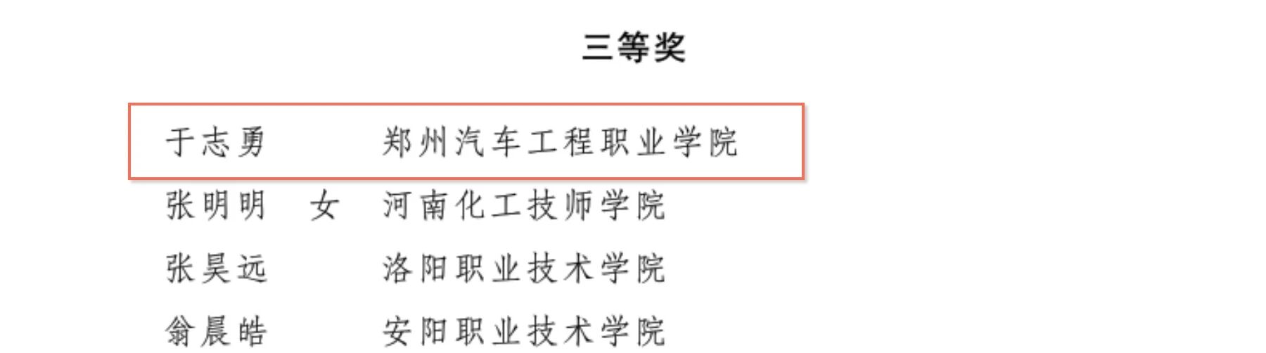 近日,河南省总工会、河南省教育厅公布关于河南省教育系统2025年度教学技能竞赛获奖情况。我校智能汽车学院于志勇老师在高职组理工综合中,凭借扎实的教学功底、出色的课堂表现和创新的教学理念,荣获三等奖,展现了优秀的专业素养和教学水平,也为我校教师队伍建设再添亮眼成果。