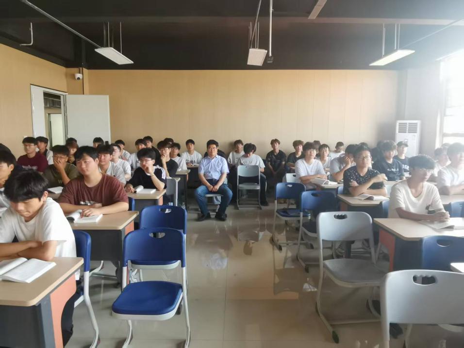 刘景华书记认真听宋老师讲课,并观察学生的反应。他称赞宋老师把握现阶段党的建设全面从严治党这个重点很好,肯定其对学生的引导到位。同时希望以后教学中精讲理论,增加联系实际的内容比例。