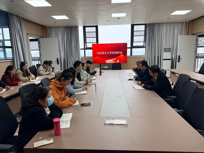 调研会在知新楼7层马院会议室进行。首先由郑彦离院长代表马克思主义学院作工作汇报。他重点介绍了学院近几个月在课程建设、师资建设、科研创新等方面开展的情况及取得的成绩,简要反映了发展过程中存在的一些问题,并提出了马院下一步建设的思路。
