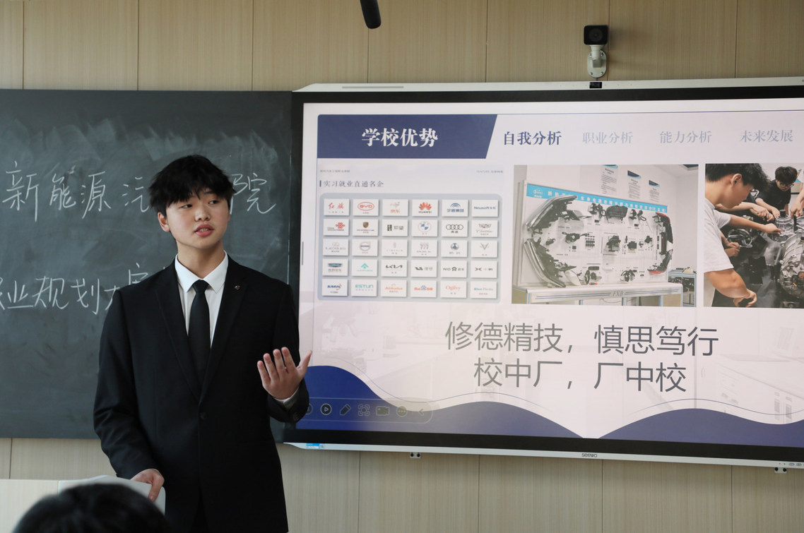 比赛当天,赛场氛围紧张而热烈。40 余名参赛选手依次登台,围绕自我认知、职业环境分析、职业目标设定、实施计划制定、评估调整等核心内容,结合新能源汽车技术、智能制造、市场营销等细分领域的发展前景,用清晰的逻辑、饱满的热情阐述了自己的职业规划蓝图。选手们的展示内容详实、目标明确、规划可行,充分展现了新时代大学生对新能源汽车行业的深刻认知与蓬勃的逐梦热情,也赢得了现场评委老师与观众的阵阵掌声。