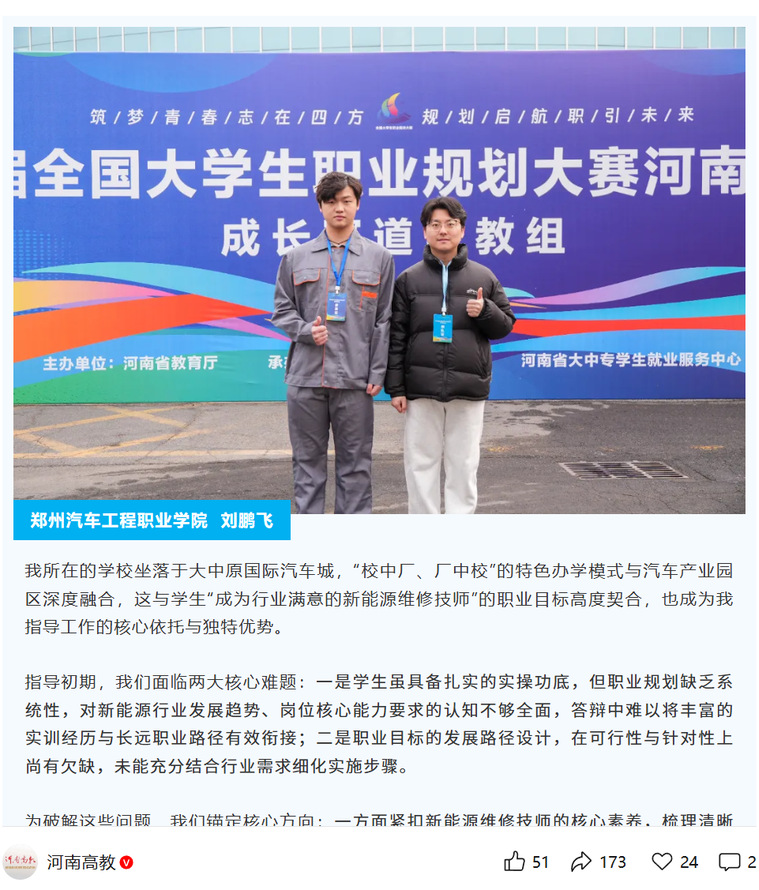 近日,第三届全国大学生职业规划大赛河南省赛决赛圆满落幕,我校学子奋勇争先,再创佳绩。来自新能源汽车学院新能源汽车技术2411班李旭同学,以出色的职业规划与沉稳的现场表现,获成长赛道职教组铜奖,为校争光!