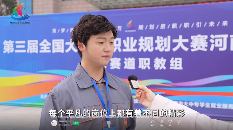 同时,李旭同学与其指导老师刘鹏飞在赛事期间接受河南高教省级融媒体的专题采访。通过主流教育媒体的宣传报道,进一步展示了我校在人才培养与职业指导方面的成果,有效提升学校的育人影响力与社会美誉度。
