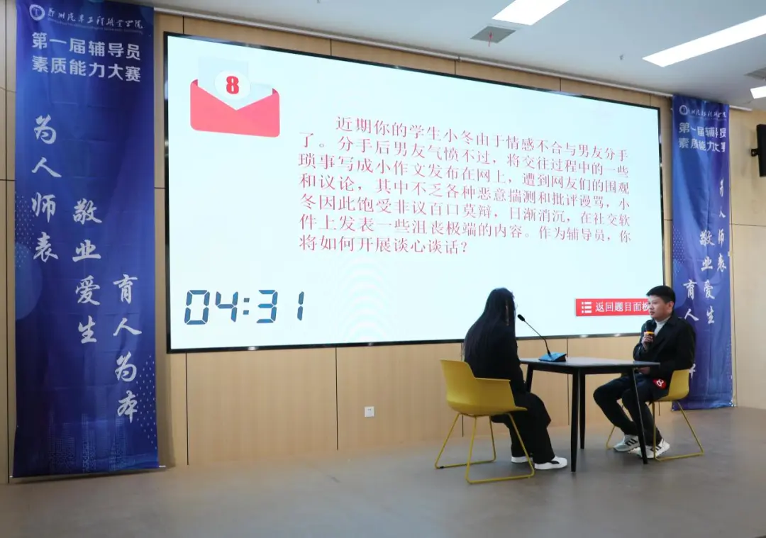 谈心谈话环节以“情景再现”的形式呈现参赛选手与助演学生交流谈心的场景,选手们针对学生提出的学业困惑、日常管理、人际关系和职业规划等各类问题,耐心倾听、悉心解答,结合自身的工作经验,与学生进行有效沟通并解决问题,展现出卓越的沟通能力和解决实际困难的能力。