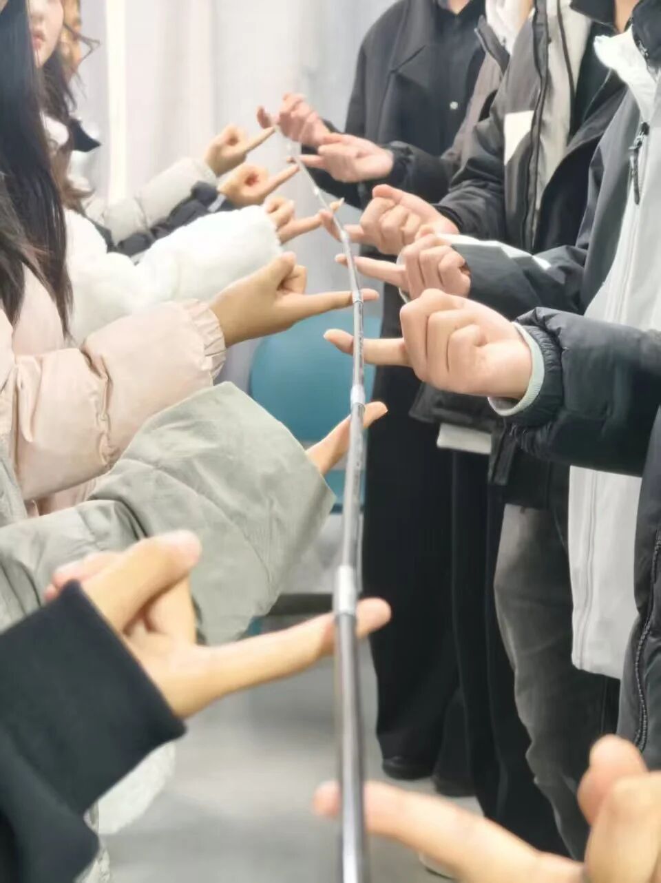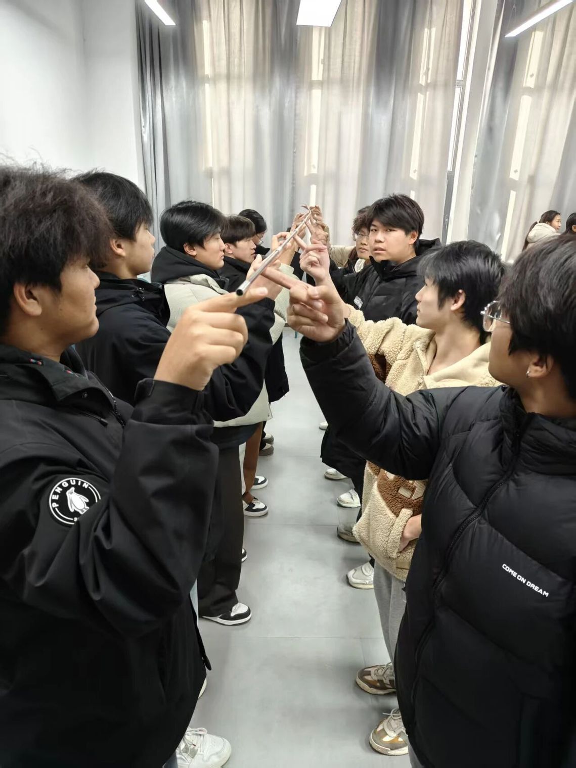 随后的“齐眉棍”项目难度升级:全体队员需用右手食指共同托住与眉毛齐平的轻质长棍,在保证棍子始终水平的前提下,将其从齐眉高度缓慢下放至脚踝位置,过程中手指不得离棍、棍体倾斜超30°即重新开始。“星火队”通过积极沟通与协作,队员间默契配合调整力度与位置,最终平稳完成下放,展现出高效的团队协作能力。“逐梦队”亦全情投入,队员们齐心协力控制下放节奏,虽遇小挑战但坚持完成,体现出良好的团队精神。