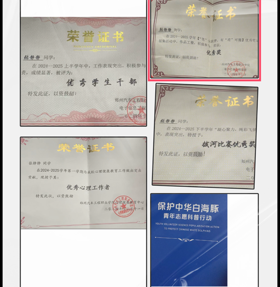 张静静,女,入团积极分子,电子信息工程学院软件技术2402班心理委员、心理健康中心协会部长、电子信息工程学院学生会干事。曾获得开云在线登录app入口优秀心理工作者、WPS职业技能初级证书、优秀学生干部、国家志愿者证书、青年志愿科普行动荣誉证书、普通话证书、河南省安全教育优秀学员、电子信息工程学院拔河比赛优秀奖等荣誉。