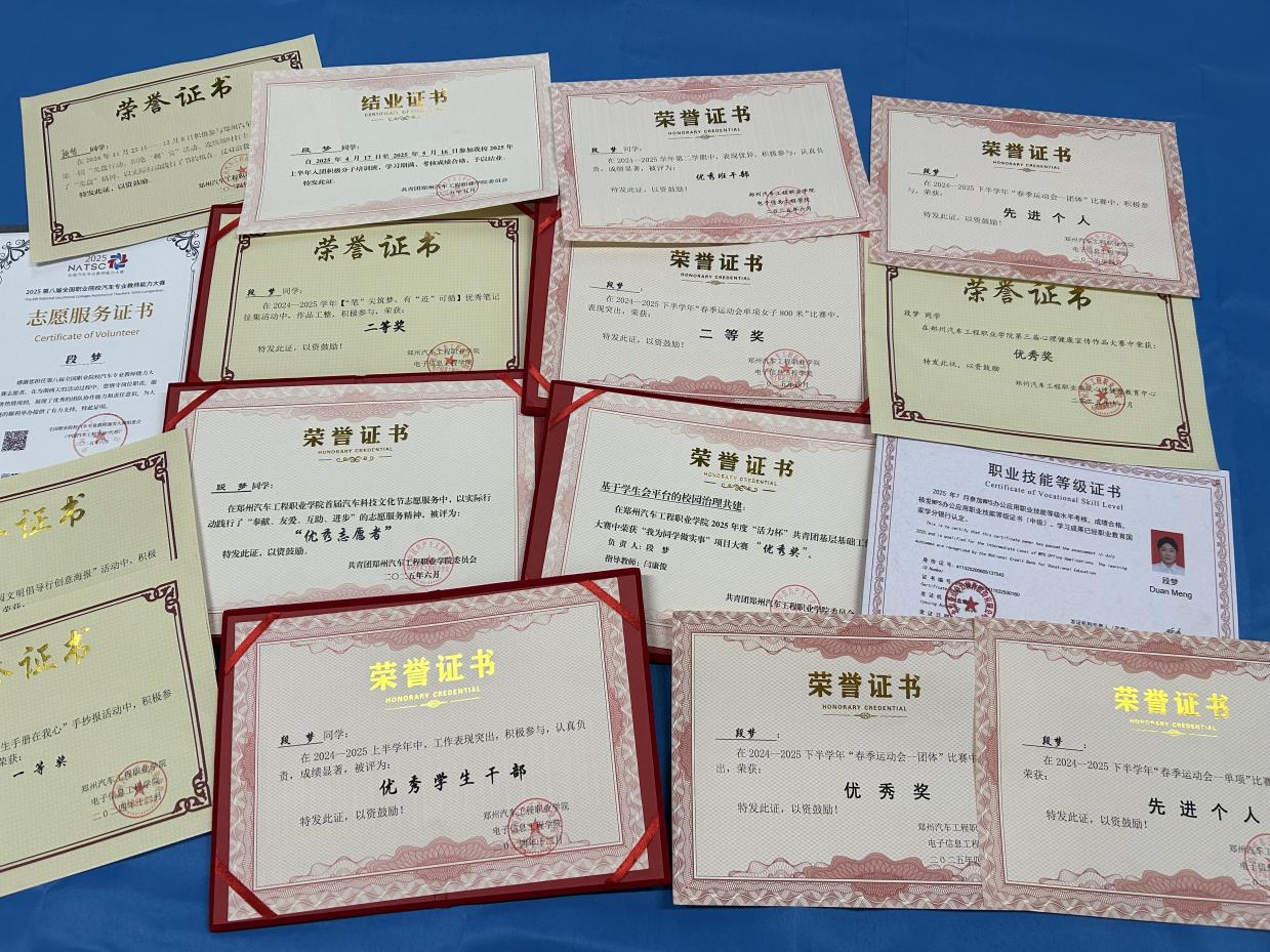 在课余生活中,她始终保持着对生活的热忱与对挑战的勇气。她积极参与志愿服务,凭借认真负责的态度成为2025第八届全国职业院校汽车专业教师能力大赛的优秀志愿者,用行动传递奉献精神;她深耕校园文化活动,在“学生手册在我心”比赛中凭借扎实积累斩获一等奖;她更在运动赛场上绽放光彩,在学校第二届运动会中奋力拼搏,夺得女子800米银牌,用汗水诠释“坚持就是胜利”的体育精神。从志愿服务到文化竞赛,从田径赛场到学生工作,她在多元舞台上不断突破自我,展现着青年学子的全面素养。