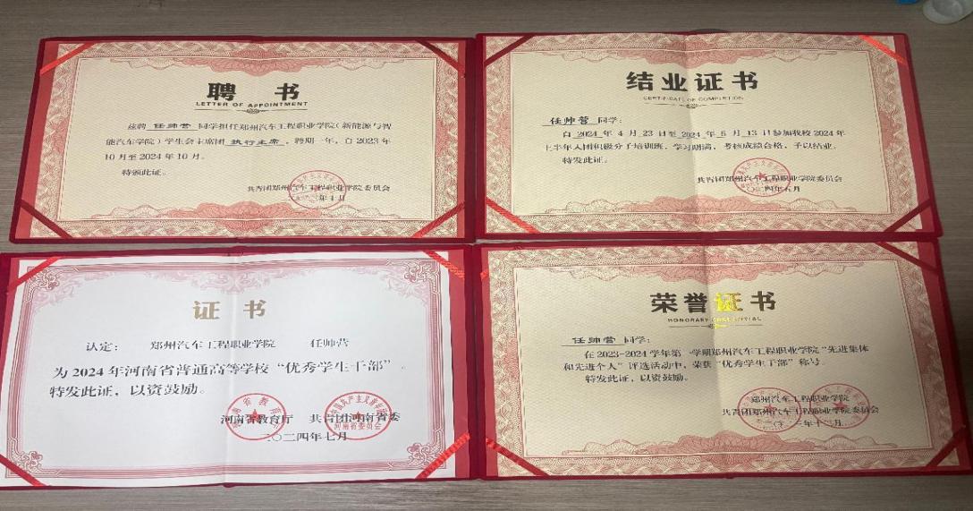 有责任有担当,青春才会闪闪发光。在校期间,任帅营身为学生干部积极带领学生会学生及班级同学参与学校文体活动,担任学生会主席期间,他定期召开学生干部例会,及时向辅导员老师交流反馈学生动态,协助处理学生突发事件。在周一到周五,带领学生会干部协助辅导员老师督促学院各班按时到课,打扫教室宿舍及卫生区卫生,推动学院禁烟禁酒工作,促进良好校风、班风、学风形成。配合学院先后顺利完成郑州宇通集团、理想汽车、比亚迪、奇瑞汽车等企业校园宣讲会的组织;积极参与策划汽车学院拔河比赛、台球比赛系列活动;组织志愿者参加学校单招考试服务工作;组织汽检专业第一届和第二届运动会开幕式方阵的选拔和训练,创新编排智能汽车主题队形,并利用课余时间组织50名学生集中训练,积极动员学院学生报名运动会各项目。在兼任办公室助理期间,他协助教师踏实认真完成文件归档、会议筹备等工作。通过多岗位历练,他锻炼了自身的组织协调能力,其务实进取的工作作风获得师生广泛好评,充分彰显了新时代学生干部的良好风貌。