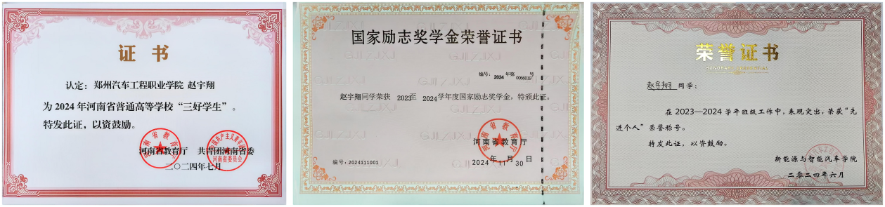赵宇翔,男,中国共产主义青年团团员,新能源汽车学院2023级学生,现任新能源汽车技术2312班班长,辅导员助理,曾获得河南省三好学生、国家励志奖学金、新能源汽车学院先进个人等荣誉。