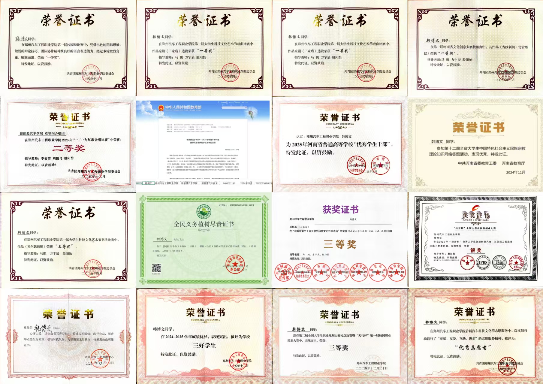 在国家级舞台上,他凭借扎实的专业素养、全面的综合能力荣获2025年“国家奖学金”,这份沉甸甸的荣誉不仅是对他学业成绩和综合表现的高度认可,更彰显了新时代职教学子的过硬实力;在省级赛事中,他一路过关斩将,斩获河南省第二十届大学生科技文化艺术节戏曲比赛三等奖,同时凭借出色的学生工作表现,获评河南省“优秀学生干部”称号,累计获得省、市级荣誉与相关活动奖项六项,在省级平台上展现了郑汽学院学子的风采;在校院两级的比赛中,从科技文化艺术节的戏曲、书法比赛,到校园辩论赛的唇枪舌战,从职业规划大赛的从容答辩,到“一二·九”红歌大合唱的凝心聚力,他屡获一等奖、二等奖等多项荣誉,在专业提升与全面发展的道路上不断探索、不断进步,书写了属于自己的精彩答卷。