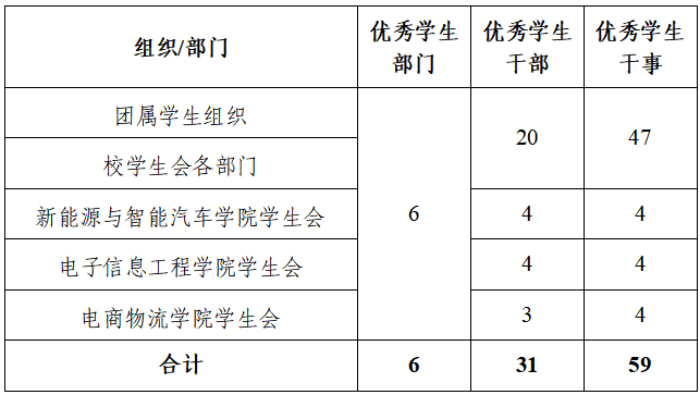 在团属学生组织及校(院)学生会中评选出“优秀学生部门”、“优秀学生干部”及“优秀学生干事”三类先进荣誉称号。