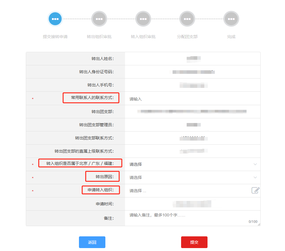 请大家认真完成以上步骤,仔细检查信息是否填写完整、正确,再点击提交,并及时跟进转接进程。有问题可联系校团委组织部或前往办公室进行咨询。