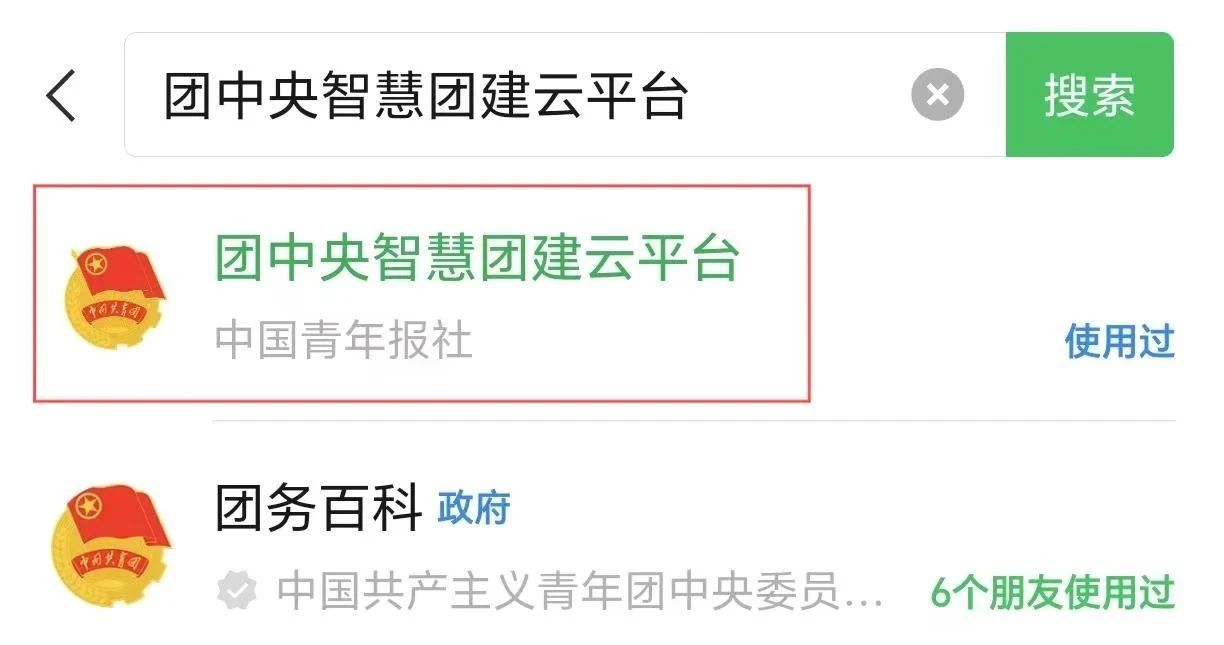 打开“微信”搜索小程序:“团中央智慧团建云平台”进入登录页面。(账号为团员本人身份证号,密码一般默认为本人身份证后八位)