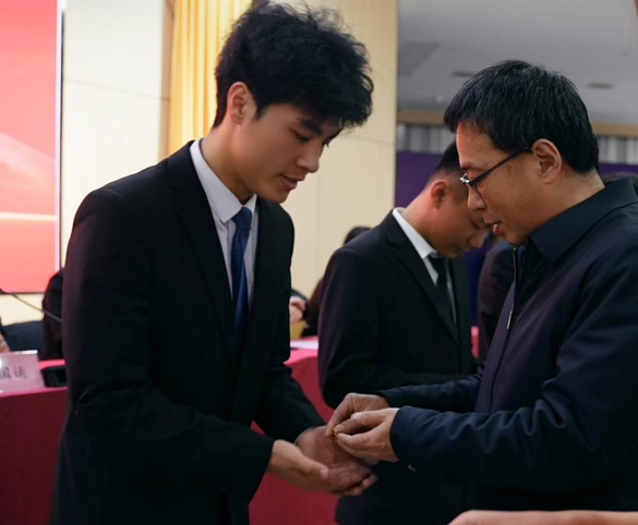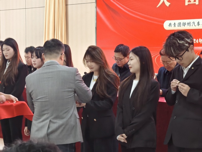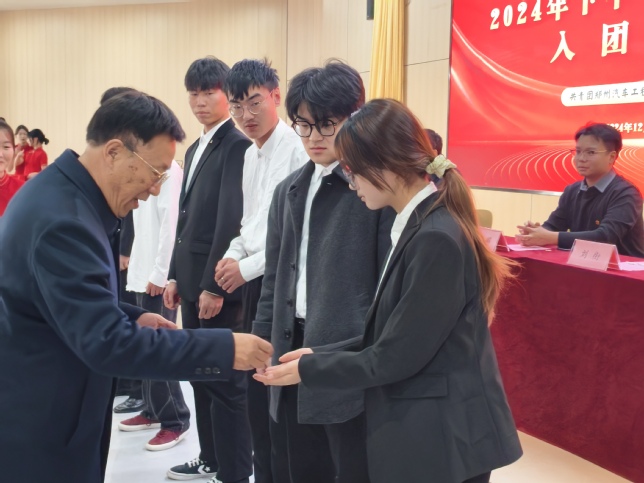 党委书记张瑞春、副校长赵国运、团委书记唐晓分别为新团员代表戴上熠熠生辉的团徽。这不仅是极大的荣誉,更是沉甸甸的责任,提醒着他们时刻牢记团员身份,在日常学习、生活中争做优秀共青团员,发挥先锋模范作用。