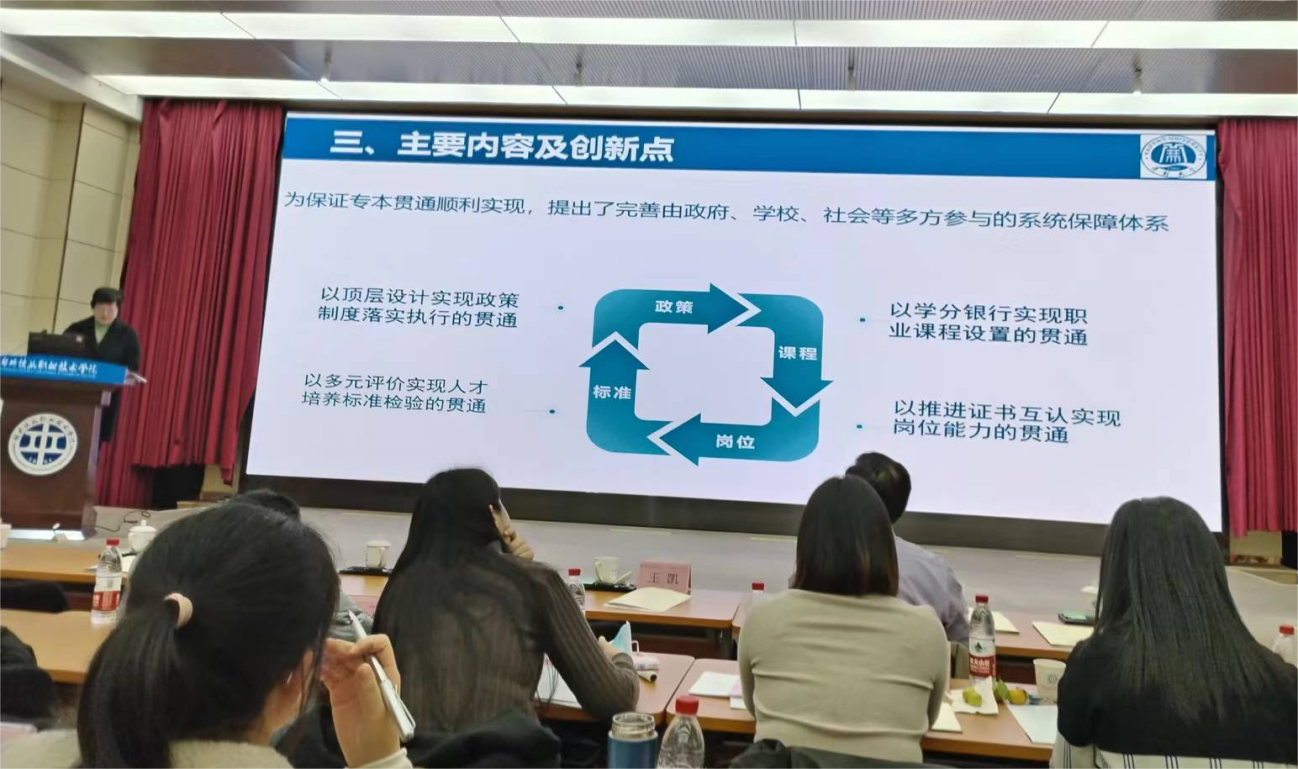 《高职院校本科教育人才培养定位及专本贯通研究与实践》成果主要完成人吴玺玫从职业教育人才基本属性出发,分享了高职教育“六维协同”人才培养目标定位模型,介绍了高职教育专科、本科人才培养规格和质量标准体系。