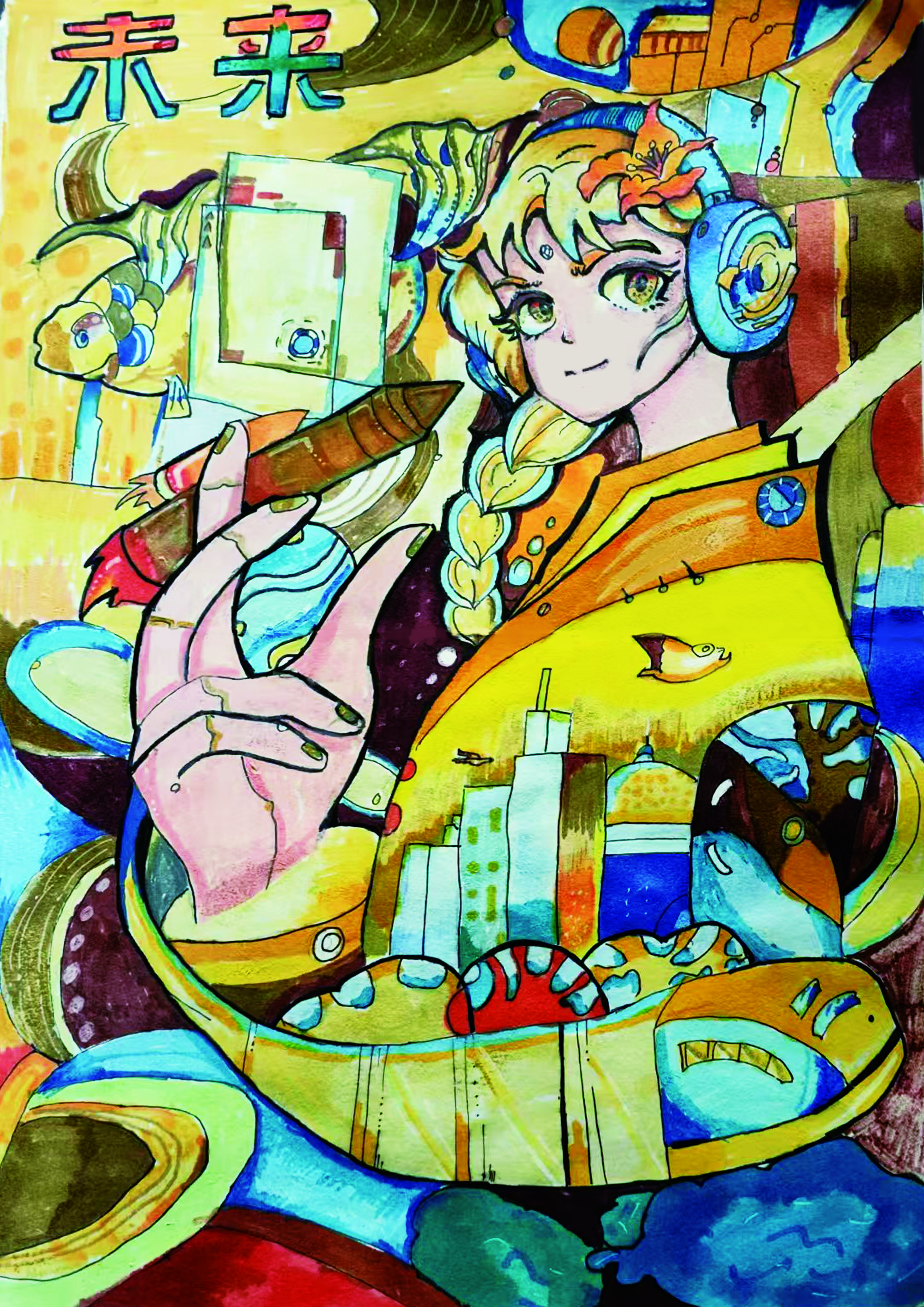 在马克笔手绘作品中,每一笔色彩都充满活力,每一条线条都表达着未来科技的无限可能。学生们将科技元素与艺术创意相融合,创造出具有未来感的视觉效果,使科技不再是冷冰冰的设备和公式,而是充满人文情怀和温度的艺术表现。