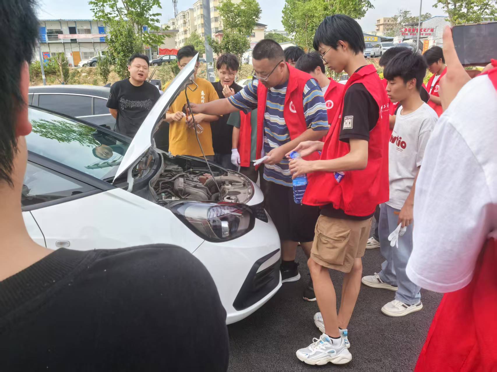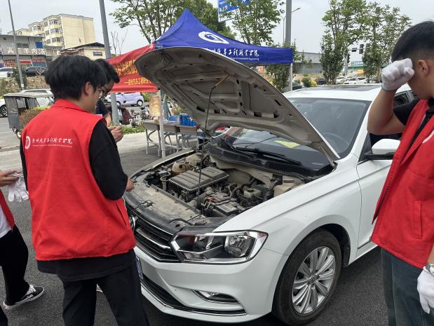 我校青年志愿者协会同学在专业课老师的指导下,主要对学校教职工车辆及社会车辆进行轮胎气压、机油液位、刹车系统等关键部位的细致检查,并提供添加玻璃水等服务。在检测结束后提供车辆诊断状况的工单,对车况较差的车主给出维护及保养建议。学生和老师还会对车辆可能出现的问题进行现场讲解,普及汽车的保养与维护知识,使车主日常的行车更加放心、安全。